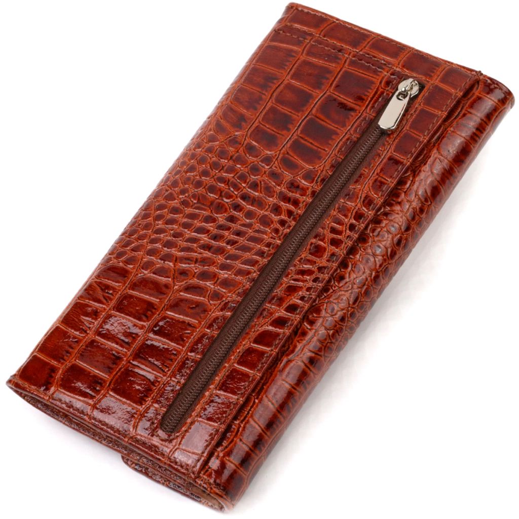 Гаманець для стильних жінок, горизонтального типу із якісної натуральної шкіри, з тисненням під крокодила. Аксесуар має одне основне відділення, шість кишень для карток, чотири прилеглі кишені та монетницю. Закривається аксесуар навпіл клапаном на кнопку. Купуючи шкіряний аксесуар цієї фірми, собі або на подарунок, будьте певні, що він прослужить Вам не один рік.