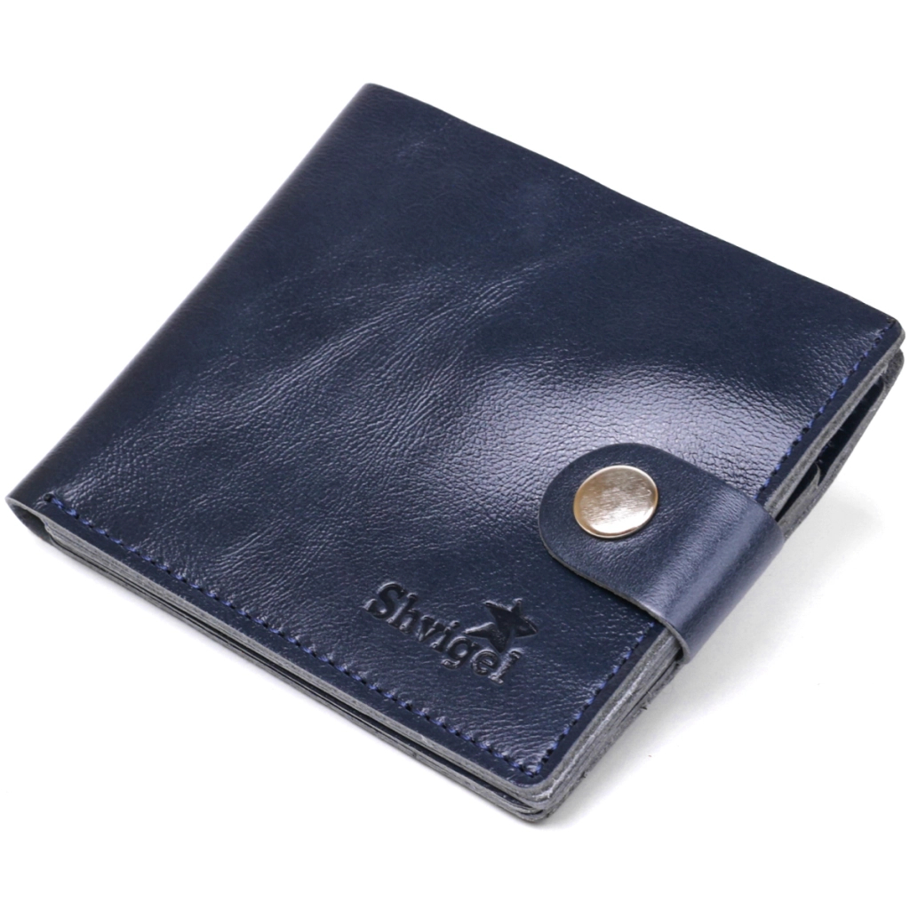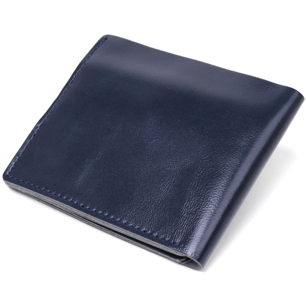 Компактне стильне портмоне в стильному акуратному дизайні. Виконаний аксесуар із натуральної шкіри високої якості та підвищеною стійкістю до зносу. Усередині є просторе основне відділення на всю довжину, кишені для пластикових карток та монетниця на кнопці. Колір виробу темно-синій, фактура гладка.