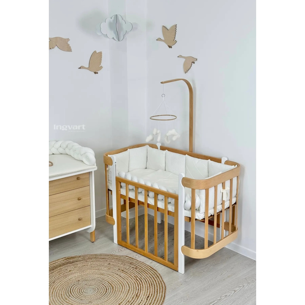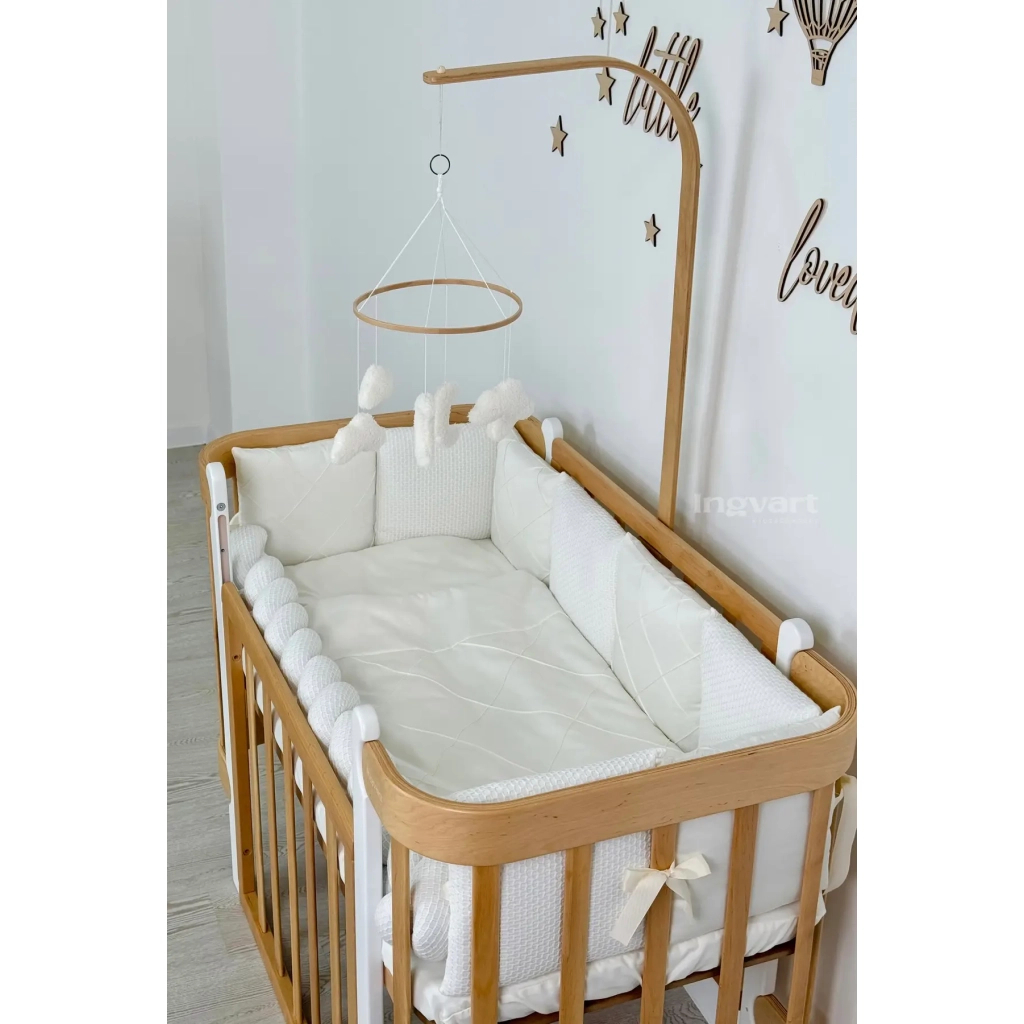 Комплект постільної білизни з 7 предметів (простирадло, бортик-косичка, бортики-подушки, ковдра, подушка, підковдра, наволочка), виготовлений з сатину.