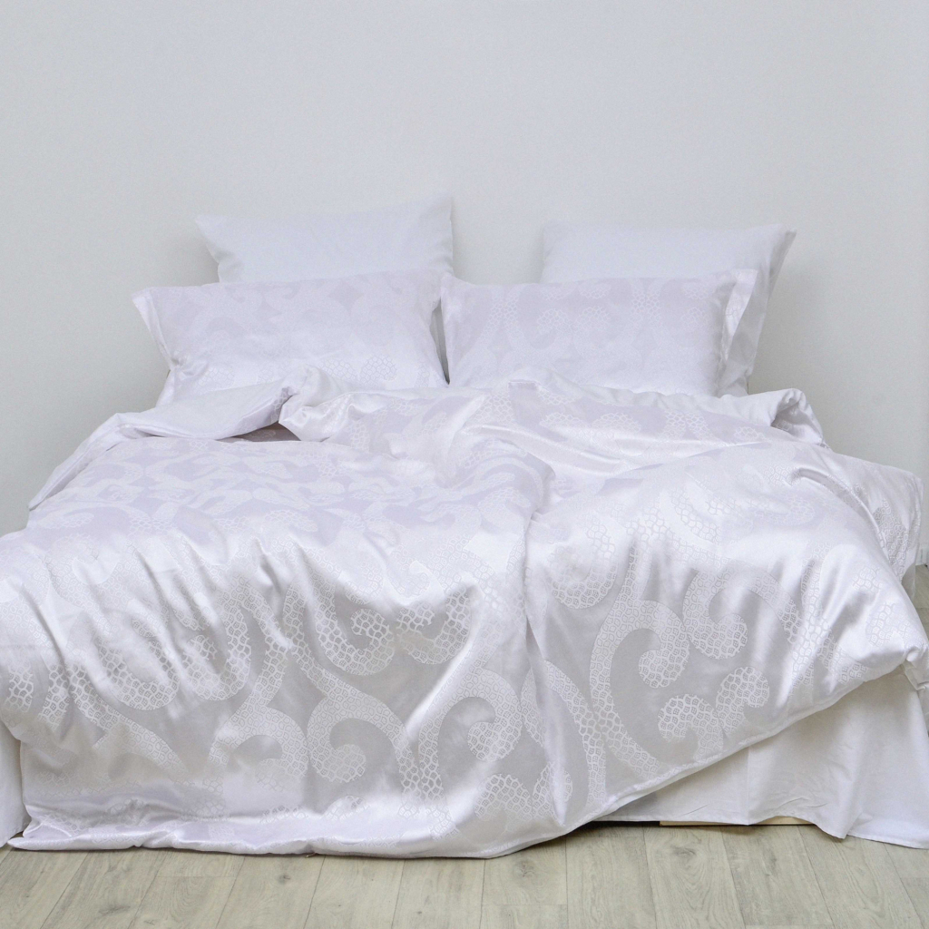 Опис: Жакардові комплекти виконані з міцної тканини з гладкофарбованою обробкою. На поверхні об'ємний орнамент, що був вплетен в основу, виконаний за допомогою спеціального верстата. При такій техніці плетіння полотна на обох його сторонах створюється орнамент різного ступеня складності.