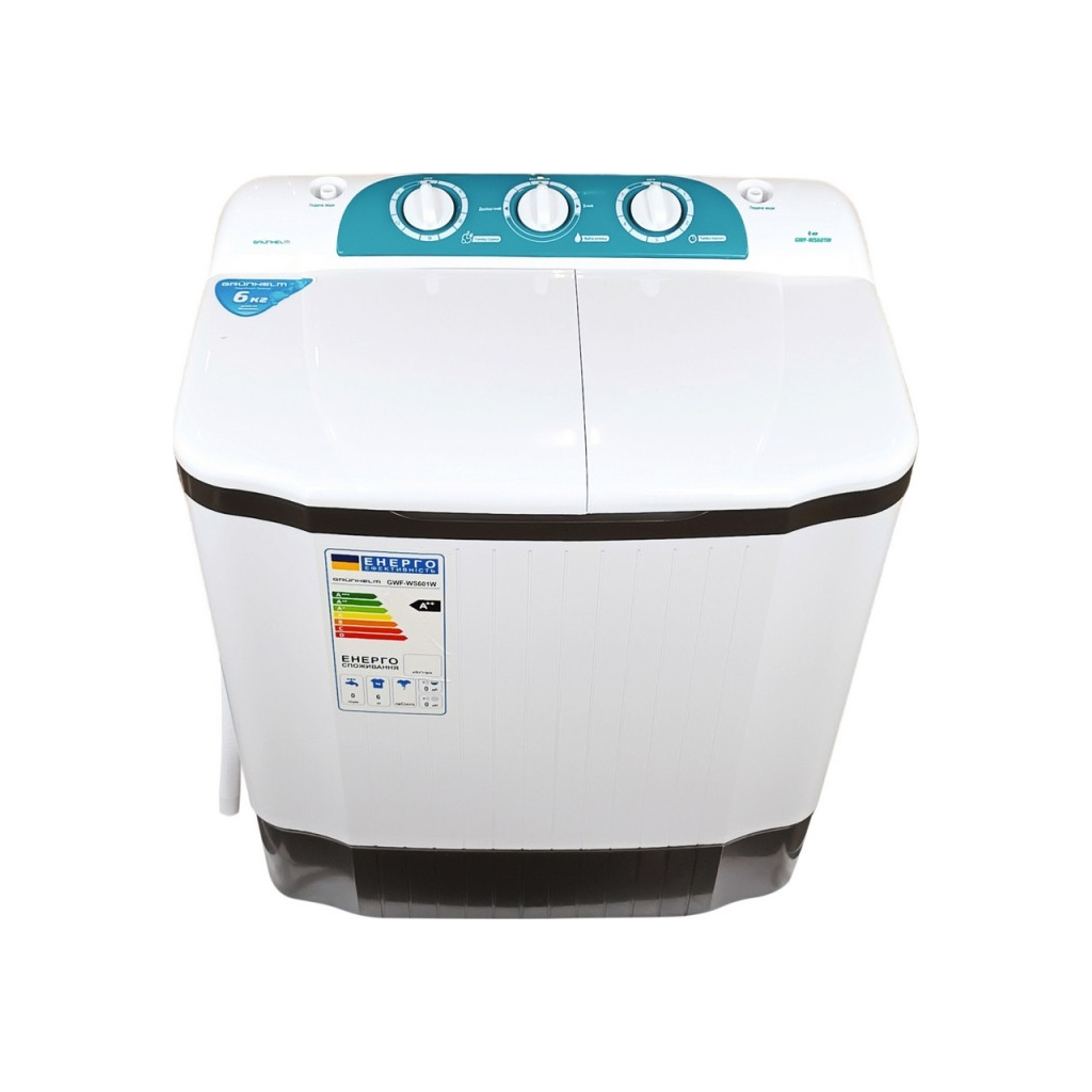 Пральна машина GWF-WS601W Grunhelm - якісна напівавтоматична модель з верхнім завантаженням білизни. Вона стане Вашим незамінним помічником й істотно заощадить кількість води і електроенергії під час прання. Машинку можна використовувати без центрального водопостачання. Максимальна завантажувальна ємність - 6 кг білизни. Машинка виконана з якісного ABS-пластика.