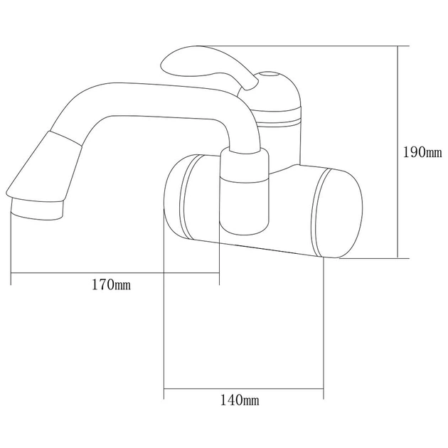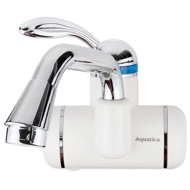 Цей проточний водонагрівач AQUATICA складається з термостійкого білого корпусу з нагрівальними елементами всередині, довгого вигнутого виливу з вбудованим аератором, важеля для регулювання натиску та температури струменя.