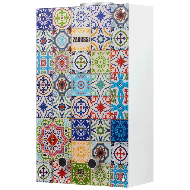 Водонагрівач газовий проточний Zanussi GWH 10 Fonte Glass потужністю 20 кВт з LED-дисплеєм, на якому відображається температура нагріву води. З основних функцій:- захист від перегріву