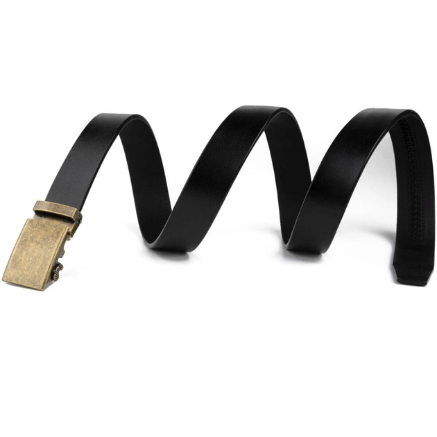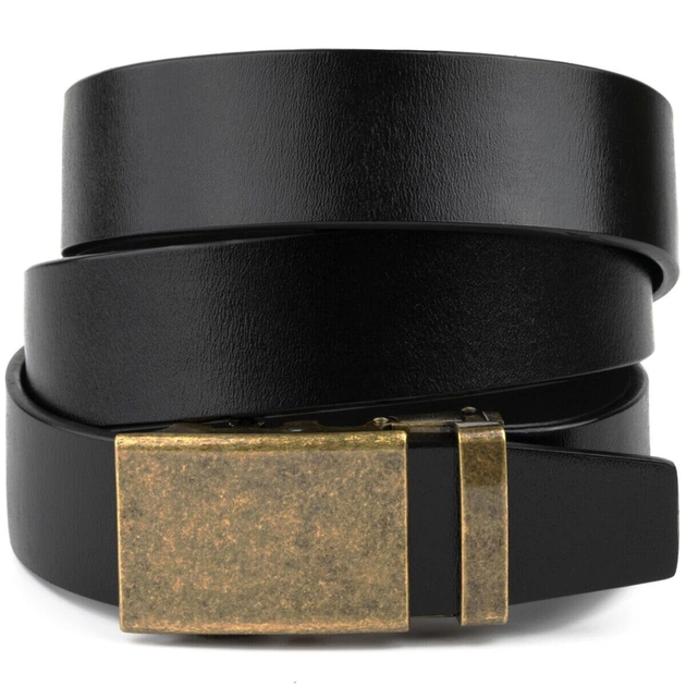 Шкіряний чоловічий солідний ремінь класичного чорного кольору з автоматичною пряжкою кольору латуні, виконаною з якісного сплаву.