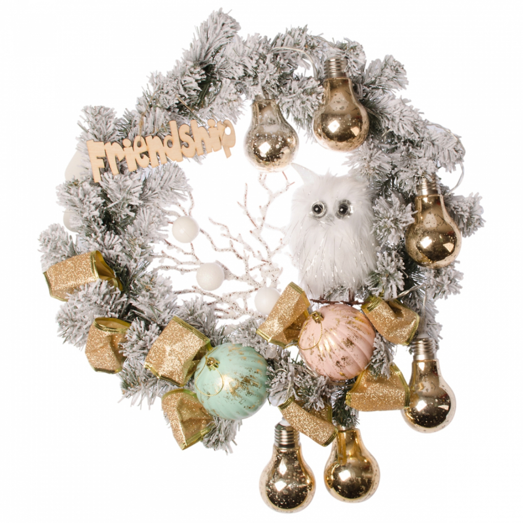 Засніжений вінок, прикрашений блискучими лампочками, стрічкою, совою та кулями стане чудовою окрасою для дому й офісу, а також гарним варіантом подарунка до новорічних свят