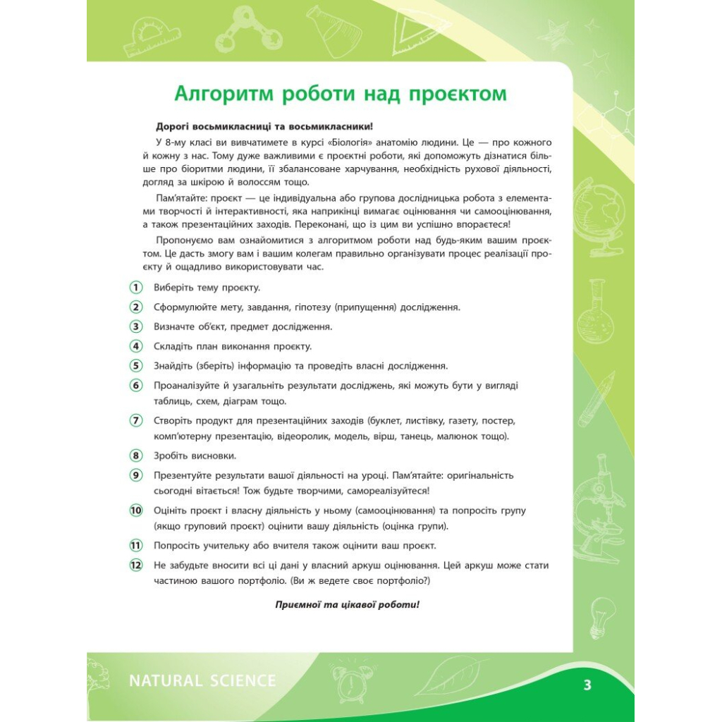 Відкриваймо для себе світ захопливої науки! Цей зошит стане вашим надійним помічником у дослідженні таємниць організму людини. У цьому посібнику ви знайдете креативні завдання, проєкти та експерименти, які допоможуть краще зрозуміти життєво важливі біологічні процеси, взаємозв’язки між органами та системами й важливість збереження здоров’я кожного й кожної з нас.