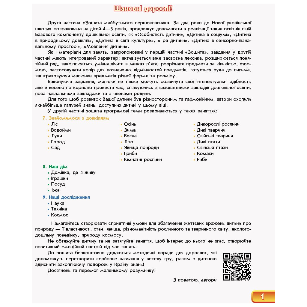 Навчальний посібник «Зошит майбутнього першокласника. За два роки до Нової української школи» спрямований на підготовку дитини до шкільного життя в родині, групах дошкільних навчальних закладів, у центрах розвитку дитини.