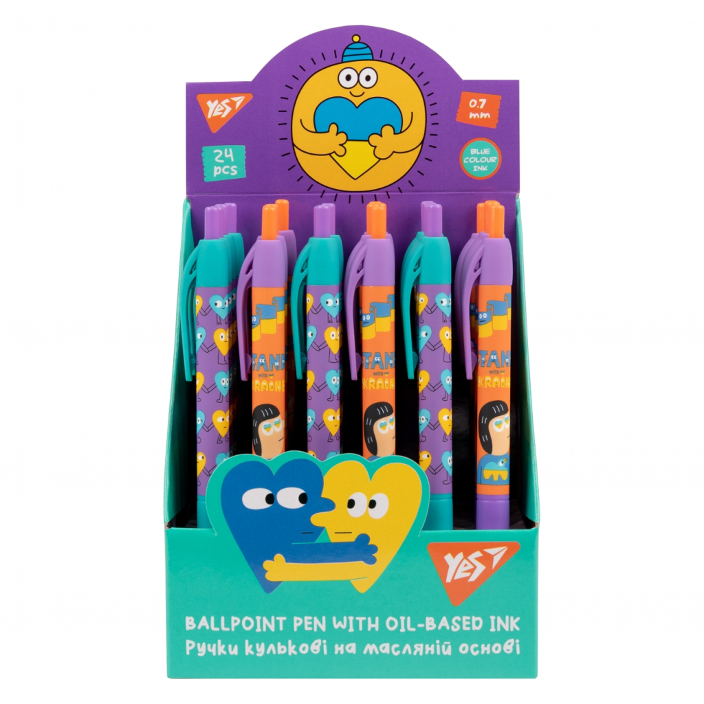 Ручки, які налаштовують на позитивний лад! Автоматичні ручки YES, з тематичним принтом та додатковим покриттям SoftTouch, заохочують до письма та дарують посмішку! Кульковий пишучий вузол Premec (Швейцарія) забезпечує плавну, а склад чорнила на масляній основі - однорідну лінію письма. Чорнило Dokumental (Німеччина) швидко сохне, не розмазується. Товщина лінії письма - 0,7 мм. Колір чорнила - синій. Тривалий термін служби, легке письмо і завжди відмінна якість — незаперечні переваги ручок YES!