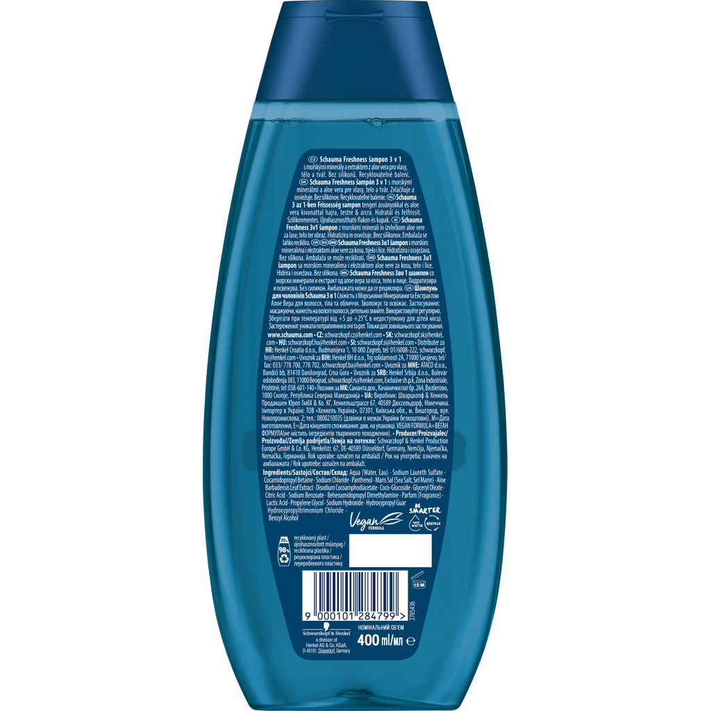 Флакон шампуню на 400 мл виготовлений з 98% переробленого пластику, а кришка — на 25%, що є вагомим кроком у захисті навколишнього середовища. Цей продукт класу мас-маркет пропонує бездоганну якість за доступною ціною та підходить для всіх типів волосся. Відкрийте для себе свіже почуття чистоти та бадьорості з Schauma Men 3 в 1 і насолоджуйтесь кожним днем із впевненістю в собі!