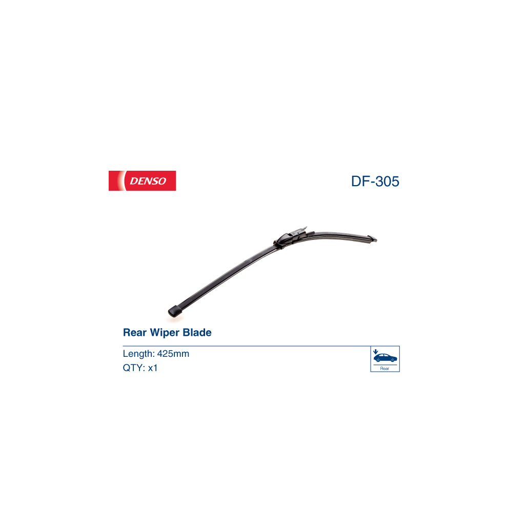 Двірник безкаркасний DENSO DF305 для заднього вітрового скла виготовляються з урахуванням особливостей під час експлуатації. Велика кількість бруду і піску в дощову погоду призводить до зносу стандартних гумок двірника, що відбивається на якості експлуатації. Популярний світовий бренд DENSO створює продукцію, продуману до самих дрібниць. Термін служби продукції даного бренду набагато триваліше багатьох інших аналогів. Довжина становить 425 мм, а спеціальне кріплення дозволяє отримати максимальну ступінь очищення.