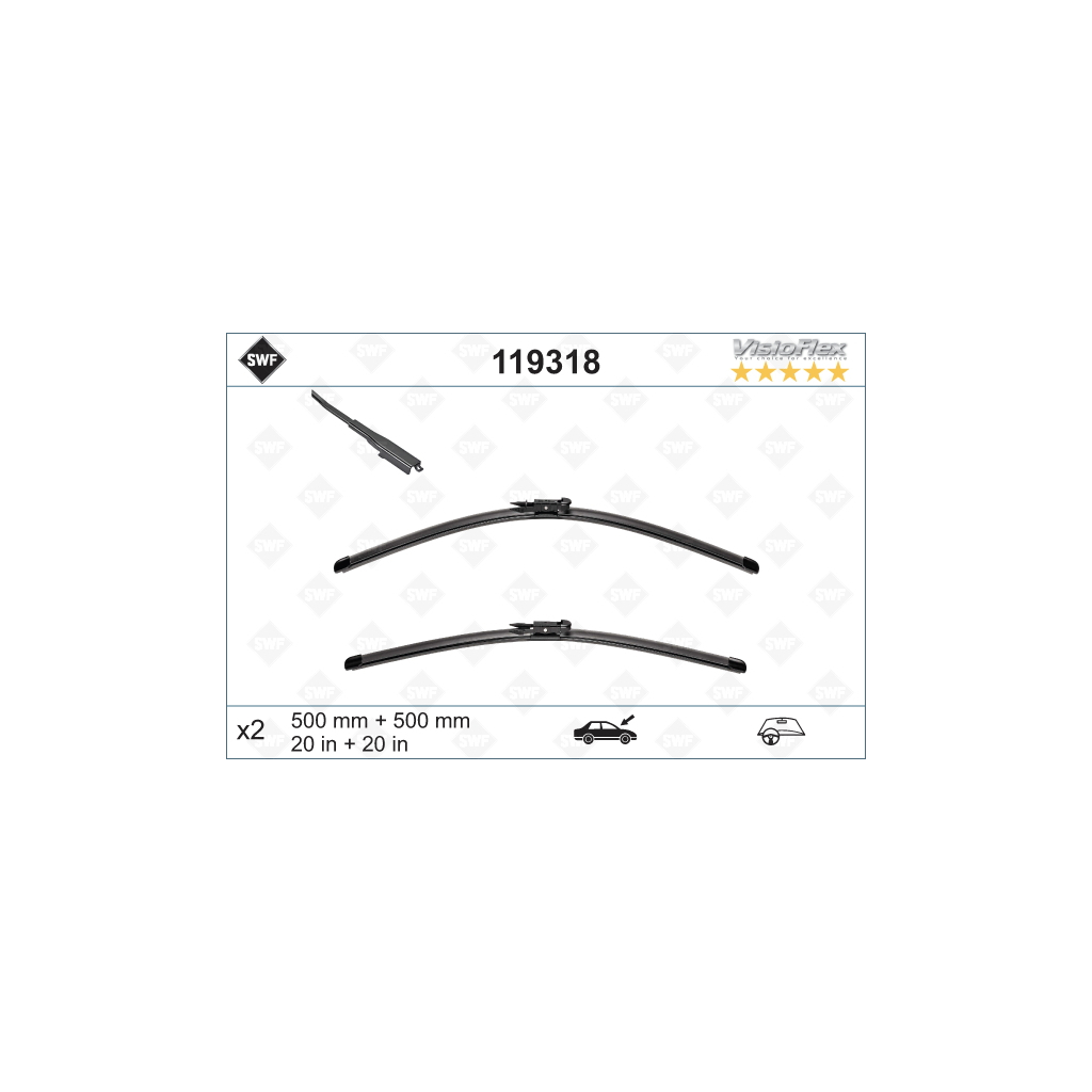 Щітка склоочисника SWF SF 119318 має високу якість і зносостійкість. У комплекті йде дві щітки довжиною 500 мм та 500 мм. Щітка є бескаркасною. Говорячи про виробника, варто відзначити, що дана німецька компанія має прекрасну репутацію на ринку автомобільних запчастин. І це виправдано, адже якість і довговічність кожного виробленого компанією SWF продукту важко переоцінити. Крім того, фірмові запчастини SWF також є на конвеєрах виробників Volvo, Nissan, Renault, Citroen, Mercedes, Peugeot, GM, BMW, VAG, Daimler-Chrysler, Audi, VW.