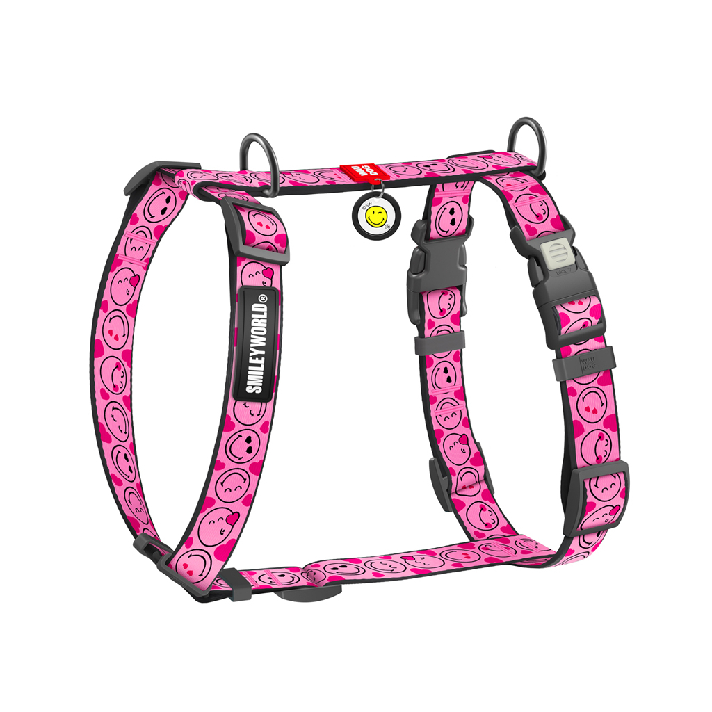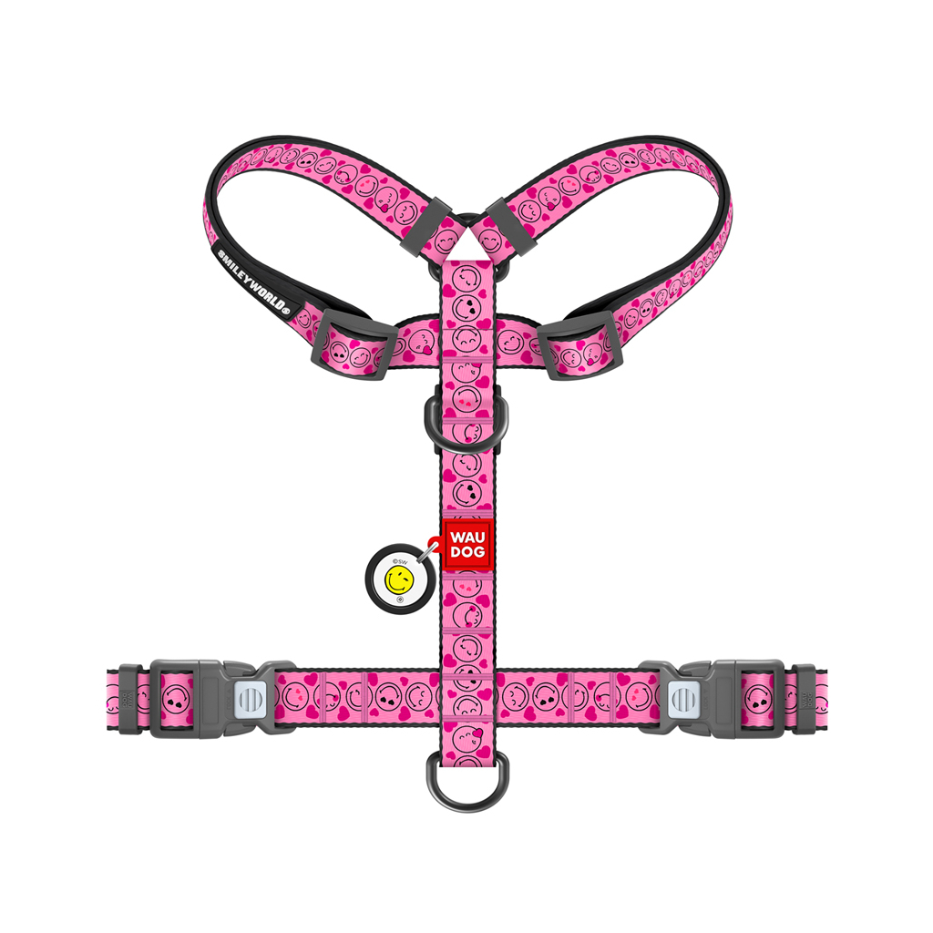 Шлея для собак WAUDOG H-подібна анатомічна Nylon з QR адресником "Смайли на рожевому" пластиковий фастекс S (343-0187)