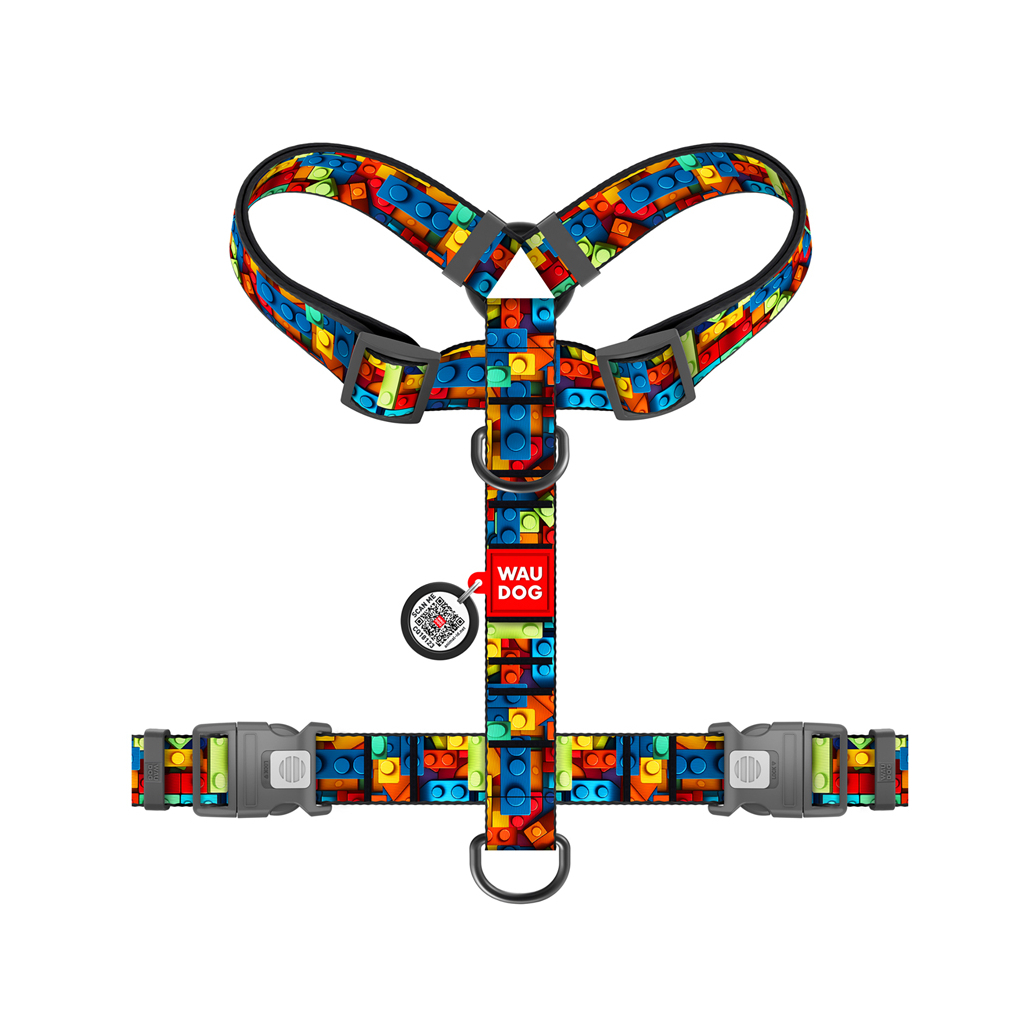 Шлея для собак WAUDOG Nylon анатомічна H-подібна з QR-паспортом "Блоки" пластиковий фастекс, L (345-4056)