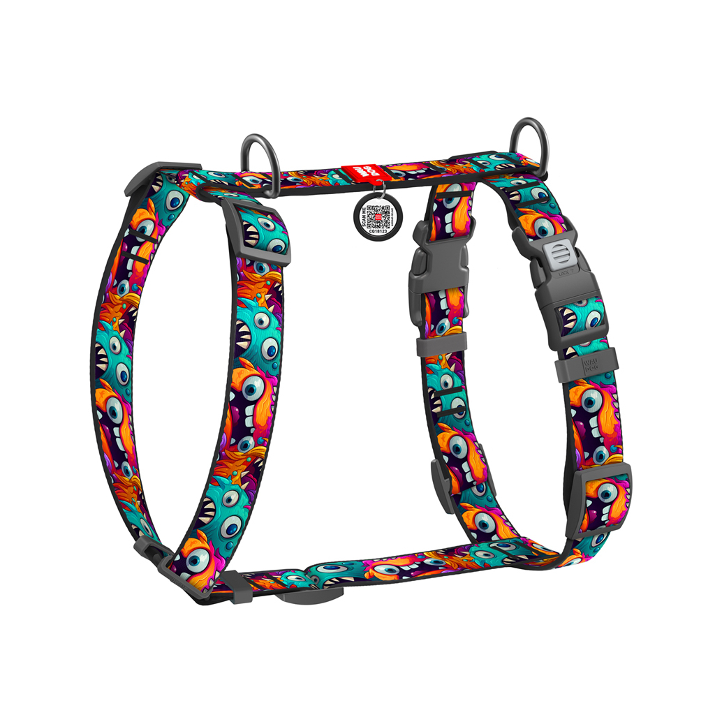 Шлея для собак WAUDOG Nylon анатомічна H-подібна з QR-паспортом "Зубасті монстри" пластиковий фастекс, L (345-4048)