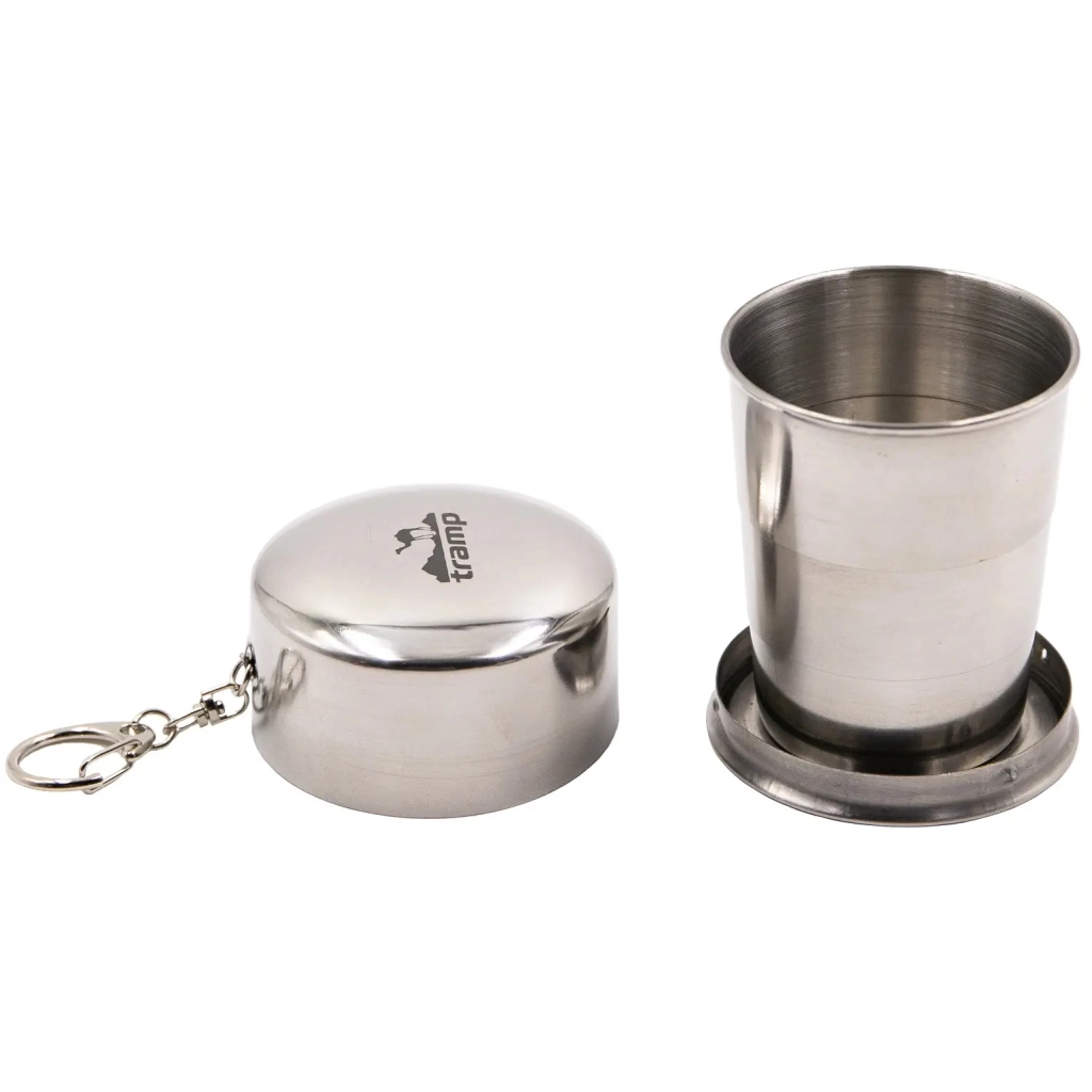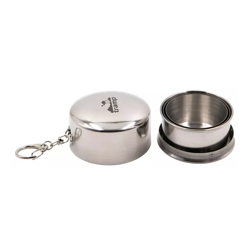 Стакан Tramp 110 мл складаний (TRC-068) компактно складається і поміщається в кишені у любителя риболовлі, полювання або туризму. Наявність карабіна дозволяє повісити виріб на ремінь або рюкзак. Нержавіюча сталь полірована для зручного миття. Складаний стакан Tramp стане відмінним подарунком.