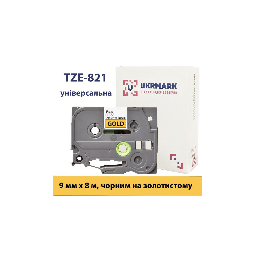 Стрічка для принтера етикеток UKRMARK B-T821P, ламінована, 9мм х 8м, black on gold, аналог TZe821 (900552)