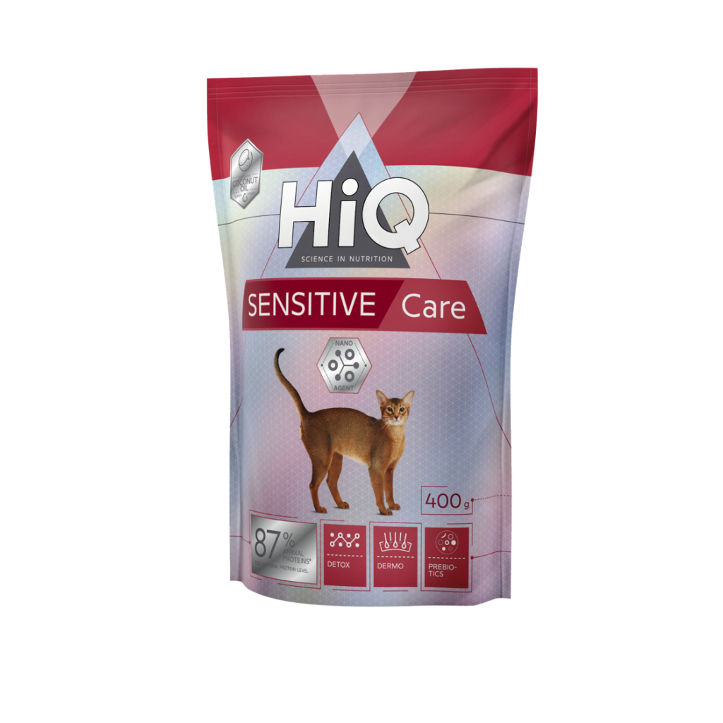 „HiQ Sensitive Care“ – сухий корм Супер-преміум класу для дорослих котів (від 1 року та старше). Спеціалізований корм прискорює засвоєння поживних речовин, полегшує роботу травної системи, а також покращує стан шкіри та підтримує густоту шерсті домашнього вихованця.