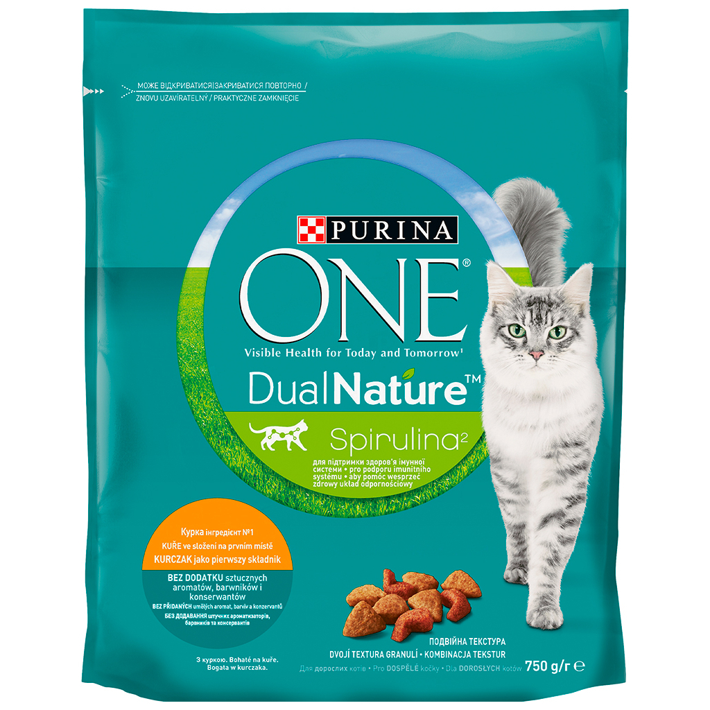 Сухий корм Purina One DualNature містить натуральну спіруліну — природний компонент, який допомагає підтримувати здоров'я імунної системи вашого кота. Спіруліна — це синьо-зелені водорості, які ростуть у теплих водах субтропічних і тропічних регіонів світу, відомі своїми особливими харчовими властивостями, які є корисними для здоров'я.