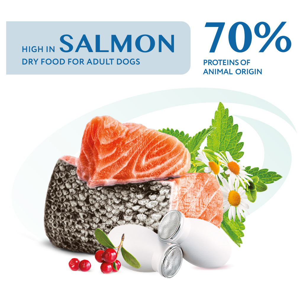 Основний інгредієнт – лосось, який не лише є чудовим джерелом протеїну, але й збагачений амінокислотами та жирними кислотами Омега-3 та Омега-6. Завдяки цьому шерсть вашої собаки буде блискучою, а шкіра – здоровою та еластичною. Корм також містить індичку, що підвищує рівень засвоюваності білків, забезпечуючи оптимальну фізичну форму вашої собаки.