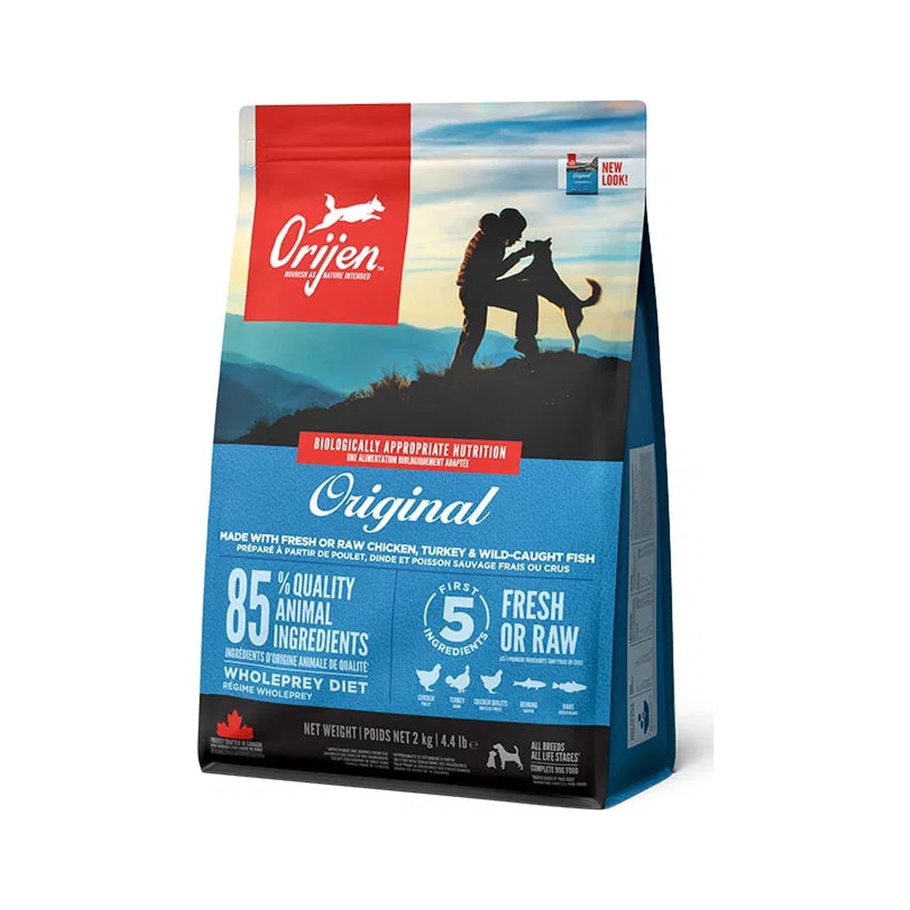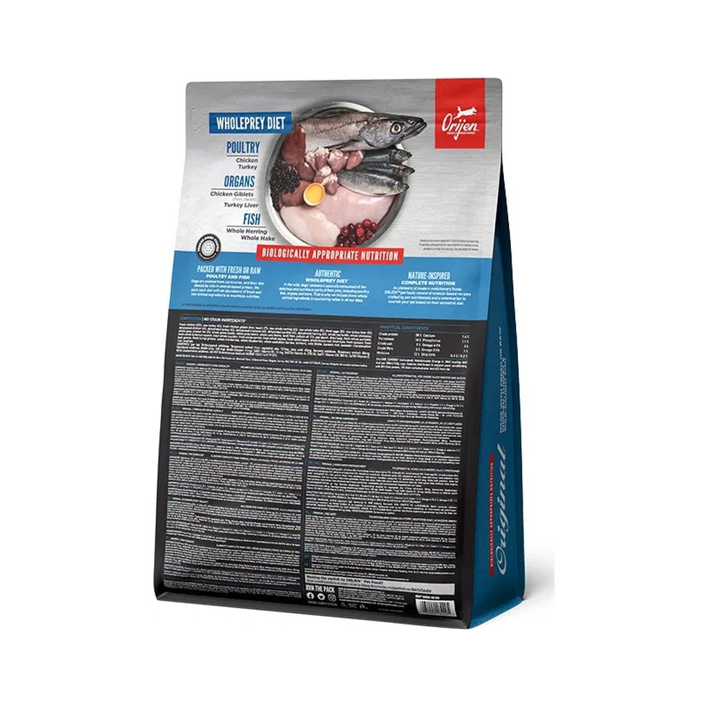 Orijen Original – повноцінний корм для собак усіх порід і стадій життя. Він створений для забезпечення високопротеїнового та біологічно відповідного раціону, багатого на різноманітні цільні м’ясні інгредієнти. Оскільки собаки за своєю природою м’ясоїдні, цей раціон містить 85% інгредієнтів тваринного походження, включаючи курчат, індиків, цільну рибу, а також нутрієнти з органів і їстівних кісток для імітації природного раціону.