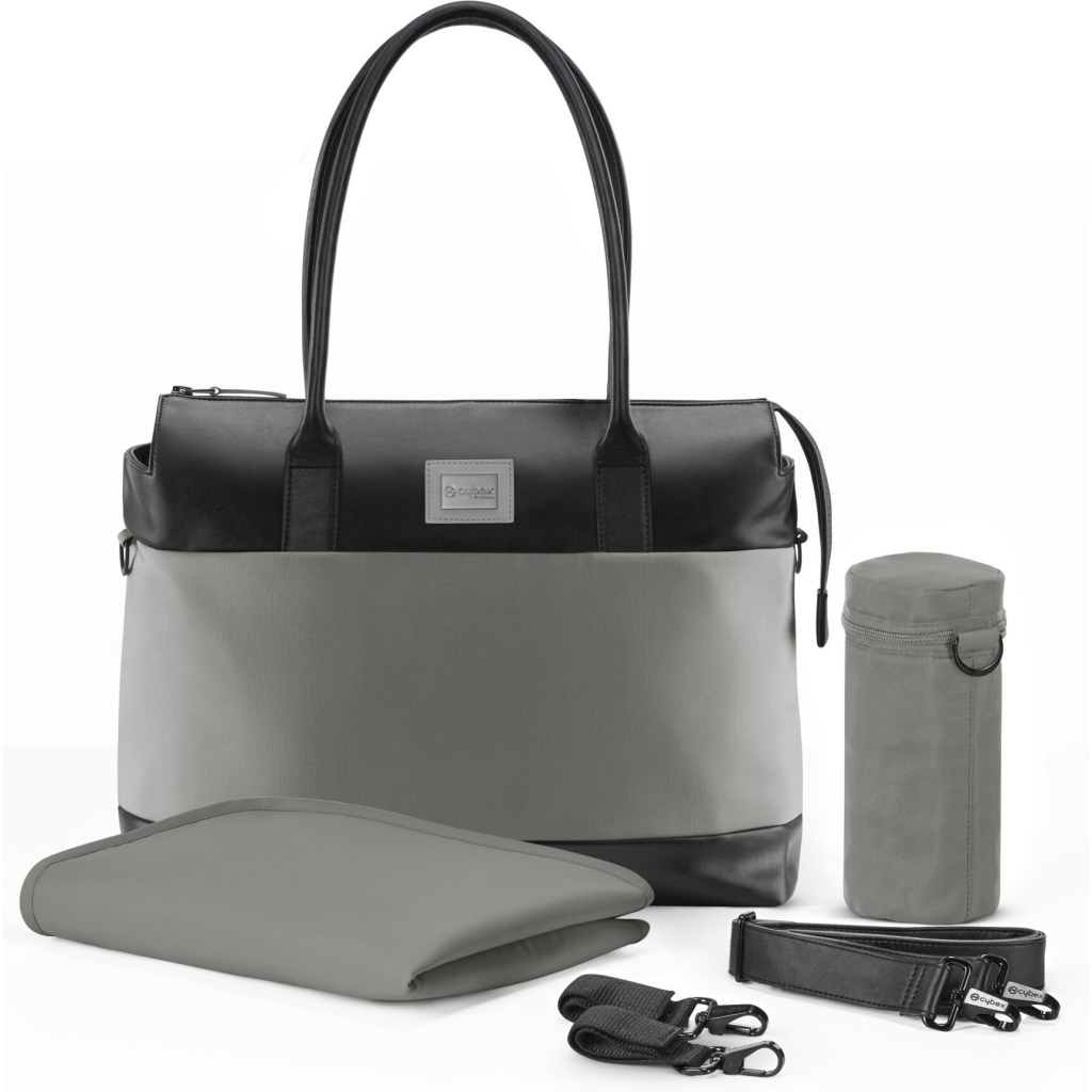 Сумка CYBEX Platinum Tote Bag містить знімний тримач для пляшечки, килимок для сповивання, відділення для вологих речей та 9 кишень. Легко кріпиться на ручку візка з допомогою карабінів.