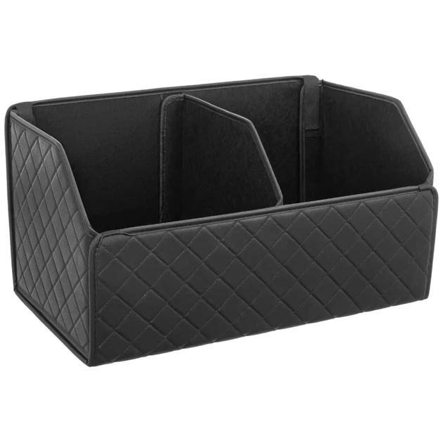 Сумка-органайзер у багажник з екошкіри, чорна (54 х 32 х 30 см) – ідеальне рішення для зберігання речей у багажнику автомобіля. Вона допомагає підтримувати порядок та забезпечує швидкий доступ до всіх необхідних предметів. Завдяки відкритому верху ви легко знайдете потрібну річ без зайвих зусиль. Просторе внутрішнє відділення зручно вміщує інструменти, продукти, автомобільні аксесуари та багато іншого. Усередині два відділення з перегородкою, яку за потреби можна зняти, отримавши один великий простір. Жорсткий каркас зберігає форму навіть у порожньому стані, а міцна екошкіра надає сумці сучасного вигляду, що підходить до інтер'єру будь-якого автомобіля.