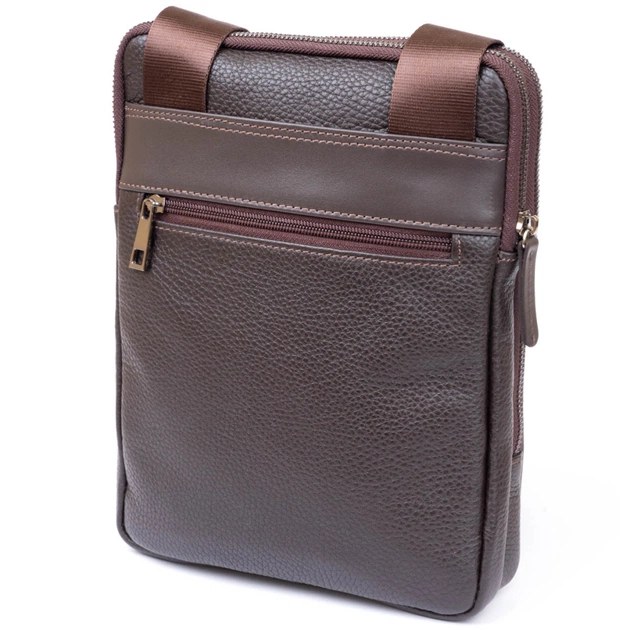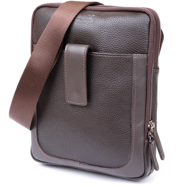 Практична сумка в зернистій шкірі "флотар" на два відділення. Модель в класичному чорному кольорі. Виробництво - Україна. Найвища якість виконання. Міцна фурнітура та якісні матеріали. Зерниста шкіра зовсім невибаглива в догляді. Довго служить і залишається в ідеальному вигляді. На виробах з зернистої шкіри менше видно подряпини і потертості. Чоловічий планшет - кращий варіант сумки на кожен день і для зустрічей. У дизайні моделі немає ніяких зайвих деталей при цьому сумка виглядає дуже модно і стильно. На лицьовій стороні моделі тиснення у вигляді логотипу бренду. Сумка доповнена вставками з гладкої шкіри з боків і хлястик на лицьовій стороні, що підкреслить її індивідуальний і продуманий дизайн, а вам в свою чергу додасть впевненості і солідності. Аксесуар доповнено текстильним незнімним ремінцем на плече. Шкіряна сумка - кращий подарунок для будь-якого чоловіка. Якщо ви хочете таку ж модель в коричневому кольорі - код для пошуку 11286, в вінтажній шкірі - 11285.