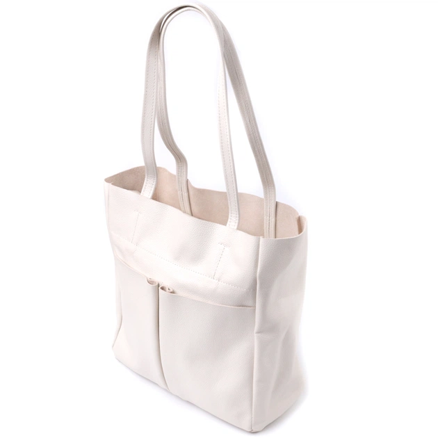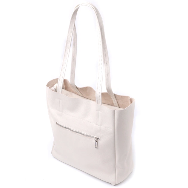Ідеальна жіноча сумка для тих, хто завжди носить із собою величезну кількість речей. Таку сумку можна спокійно носити на роботу, в неї добре поміщаються всі особисті речі і папки з документами. Також таку модель зручно брати із собою у подорожі та виглядати завжди стильним та елегантним. Колір моделі – бежевий, фактура – зерниста. Матеріал виконання – натуральна шкіра з високими показниками стійкості до зношування. Для перенесення використовуються дві міцні надійні ручки. Сумка має знімне ущільнене дно прямокутної форми, щоб надати за бажанням більш чітких форм аксесуару. Фурнітура срібного кольору – стійка, не змінює свій колір у процесі носіння. Аксесуар чудово поєднується з усіма стилями в одязі та може стати чудовим подарунком на будь-яке свято.