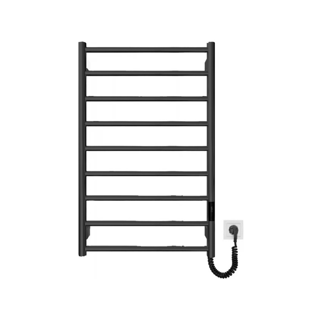 Електросушарка для рушників побутова Урбан-I 810x500-85мм. Обладнана таймер-регулятором та конектором для підключення в розетку з будь-якого боку. Сумісна з комплектом прихованого підключення. Має 9 ребер та стояки з круглої труби.