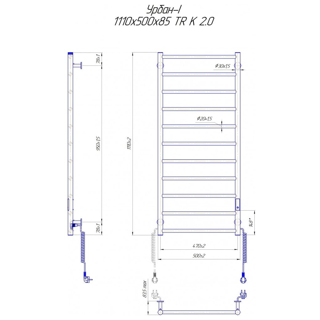 Електросушарка для рушників побутова Урбан-I 1110x500-85. Обладнана таймер-регулятором та конектором для підключення в розетку з будь-якого боку. Сумісна з комплектом прихованого підключення. Має 11 ребер та стояки з круглої труби.