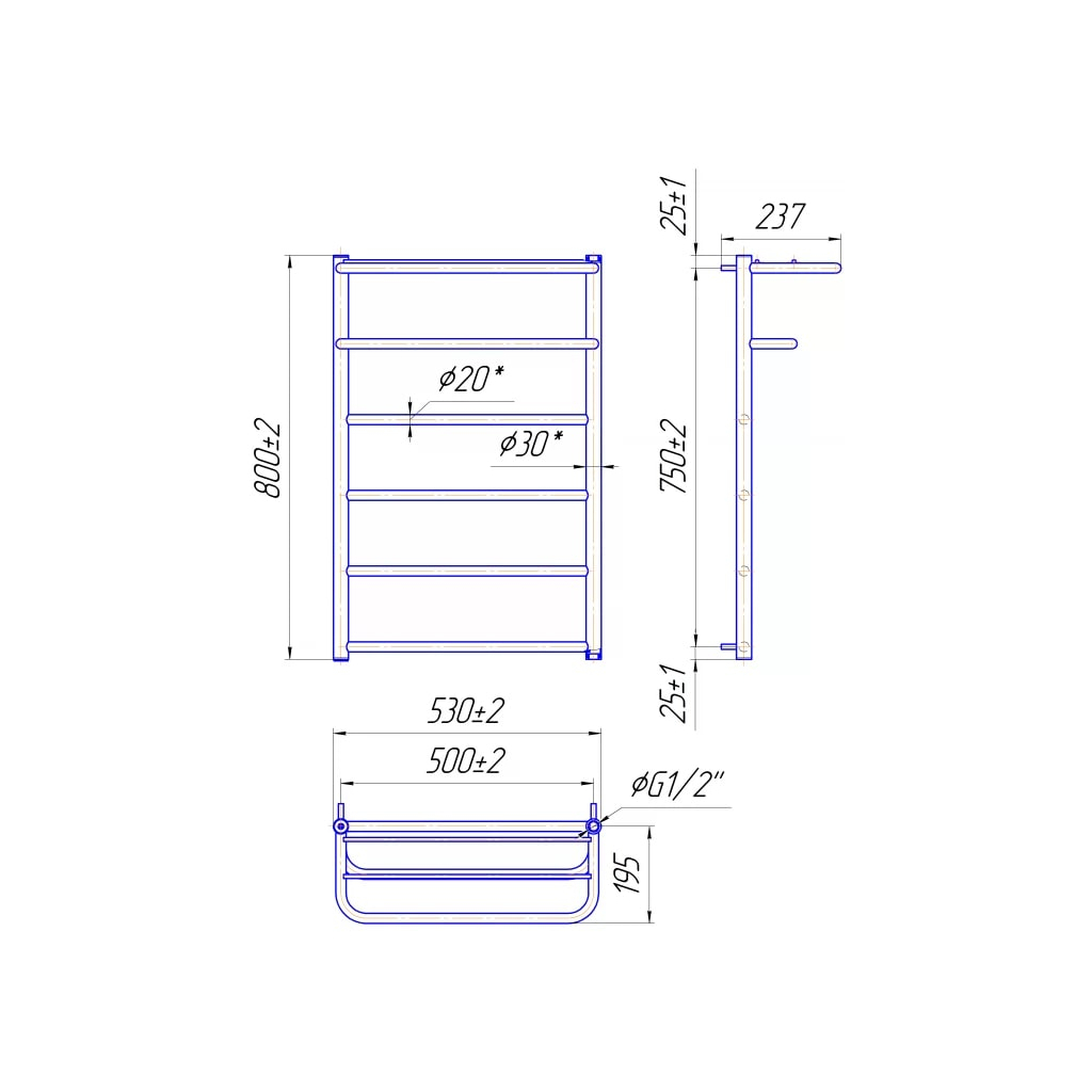 Рушникосушарка "Маріо" Hotel 800х530/500. Розміри: висота - 800 мм, ширина - 530 мм, глибина 260 мм, міжцентрова відстань для підключення - 500 мм, діаметр підключення G1/2''. Варіанти підключення: нижнє, діагональне та бічне. Кількість ребер - 6, стояки з круглої труби. Виготовлена з полірованої нержавіючої сталі без хромування.