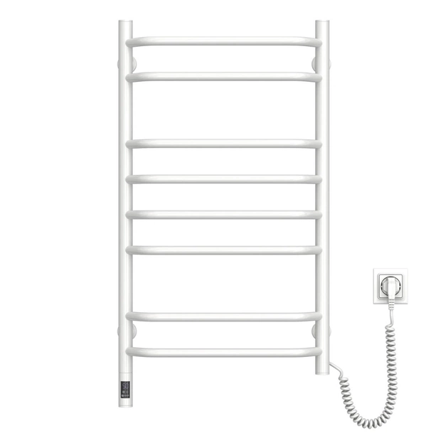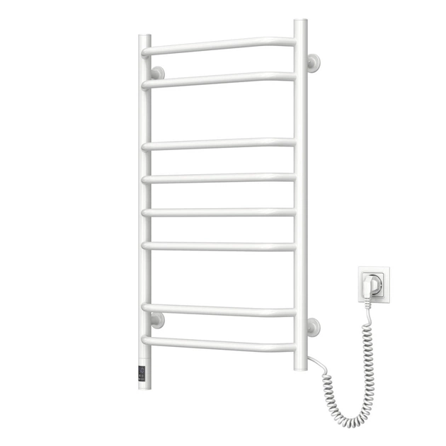 Електрична рушникосушка Блюз 800×480 мм з правим підключенням і таймер-регулятором. Має 8 секцій, виготовлена з фарбованої сталі, білий колір. Потужність 142 Вт, ступінь захисту IP44, максимальна температура 55°C.