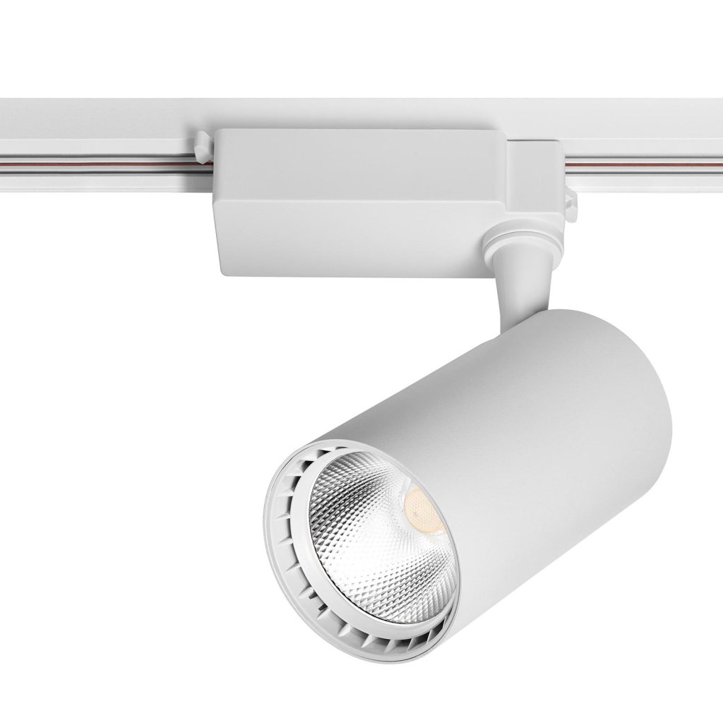 Особливу увагу варто звернути на циліндричну форму світильника, виконану в елегантному білому кольорі, що дозволяє йому гармонійно інтегруватись у будь-який інтер'єр, додаючи йому сучасності та стилю. Завдяки накладному типу монтажу, світильник легко встановлюється на трекову систему освітлення, що дозволяє створювати індивідуальні схеми освітлення для вашого приміщення, додаючи варіативності та гнучкості в його використанні.
