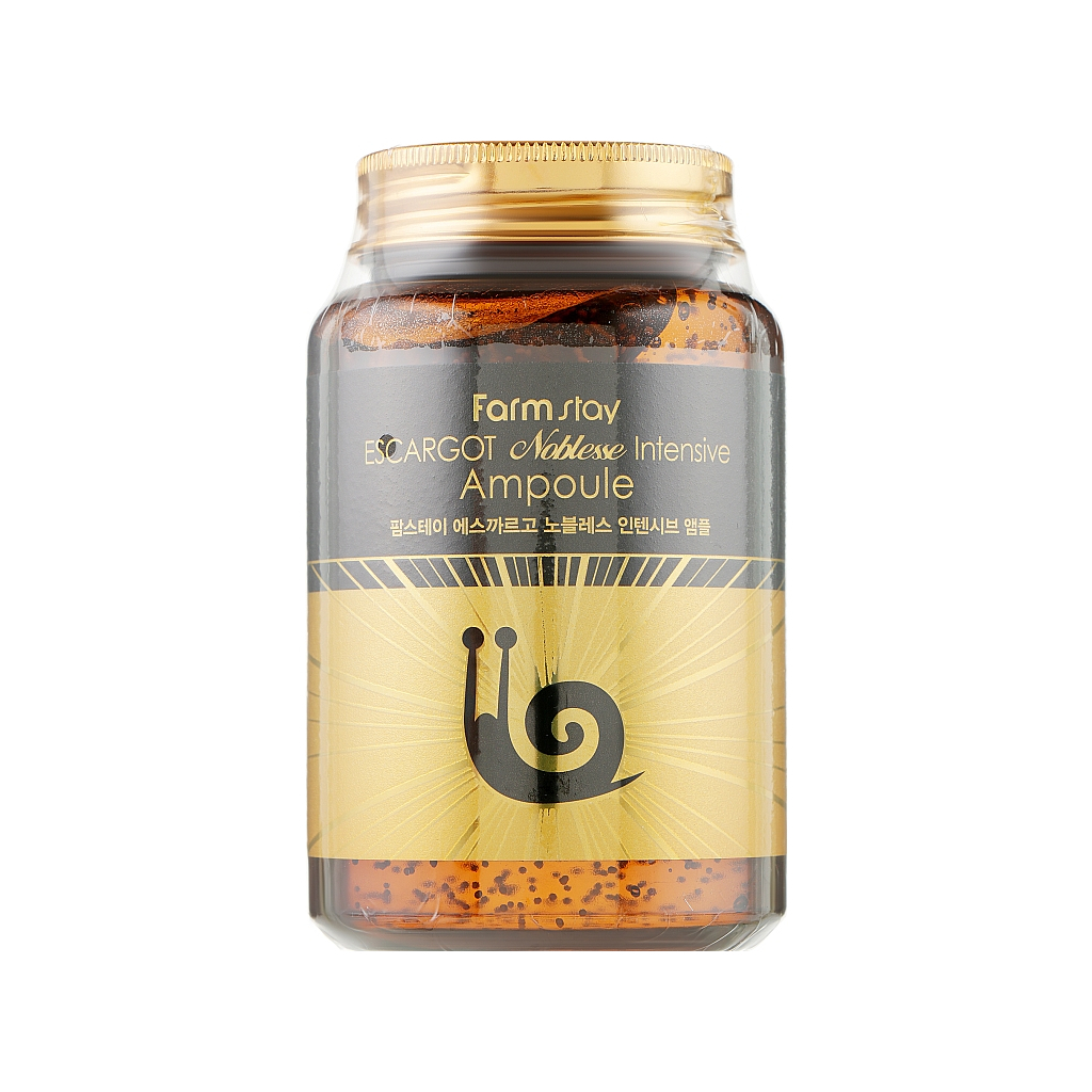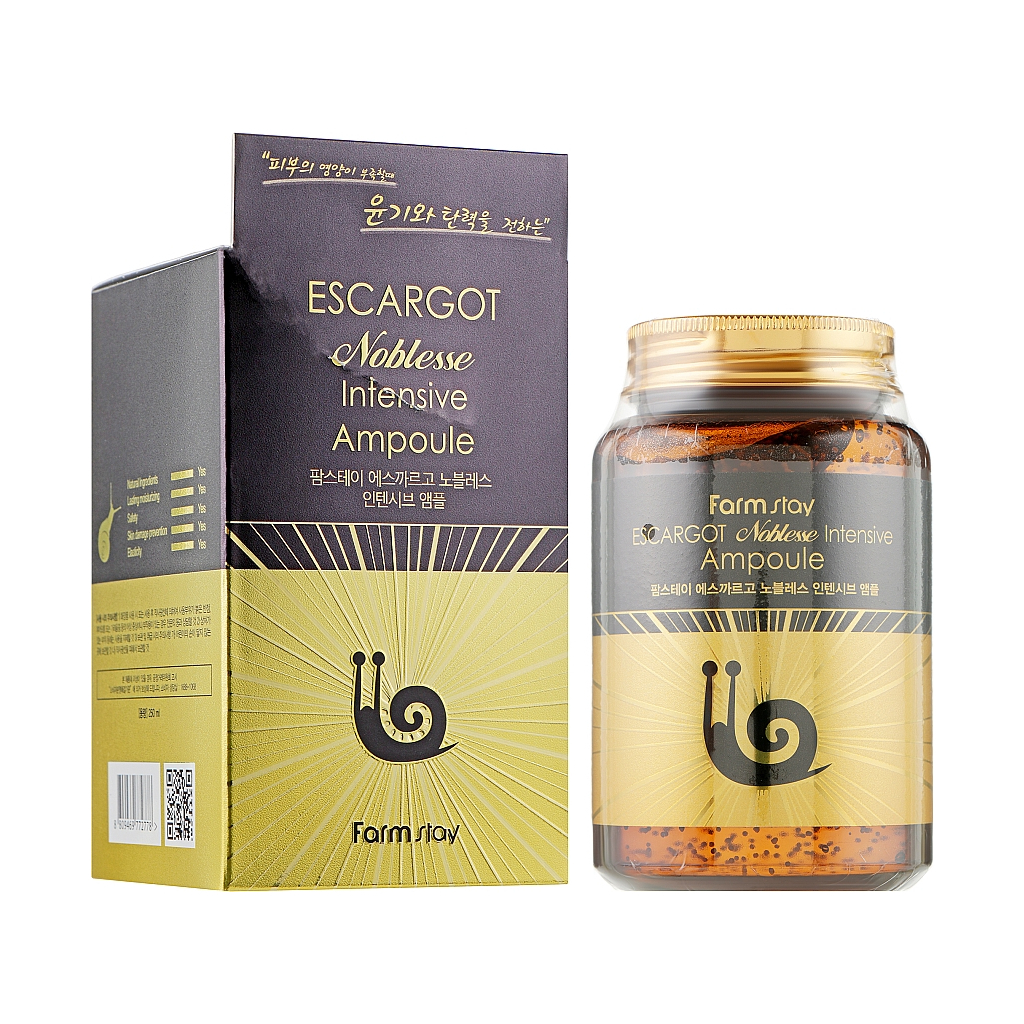 Якщо ви шукаєте ефективний догляд для боротьби з віковими змінами, віддайте перевагу ампульному засобу від корейського бренда FarmStay. Escargot Noblesse Intensive Ampoule має властивості живильної есенції, очищувального тоніка та зволожувальної сироватки. Тому ви скоротите кількість походів до косметолога і позбудетеся необхідності захаращувати туалетний столик численними баночками.