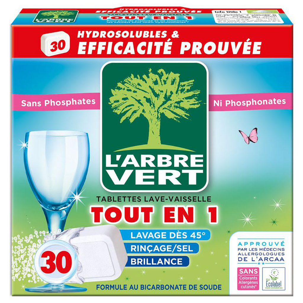 Таблетки для посудомийних машин, так само, як і вся продукція L'Arbre Vert зроблена на основі компонентів органічного походження, які безпечні для людей і довкілля, підтверджено сертифікатом EU Ecolabel (Екознак ЄС).