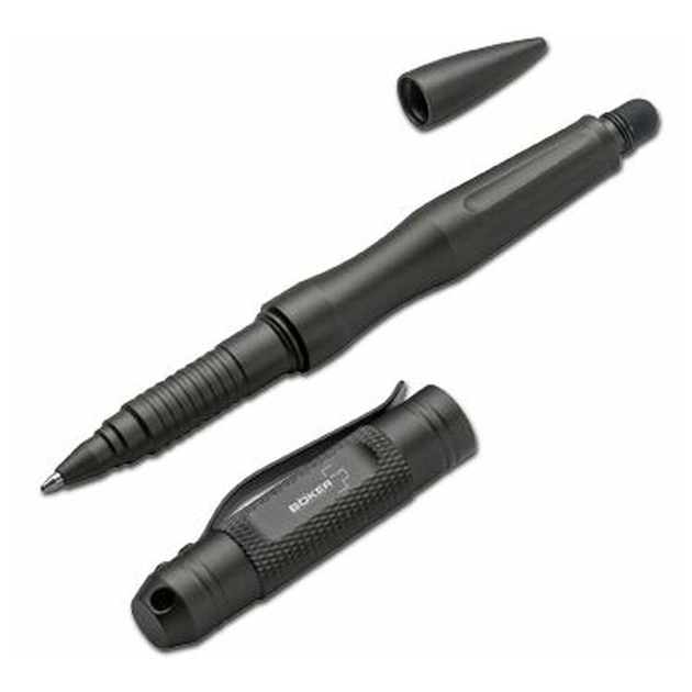 Враховуючи все більше поширення планшетних комп'ютерів, тактична ручка Boker Plus iPen Security забезпечена гумовим накінечником для використання на сенсорних екранах, який добре захищений задньою кришкою, що відкручується. Як завжди, великий ковпачок передньої частини приховує стандартний кульковий накінечник. Полірований алюмінієвий корпус має додаткову поверхню для нанесення гравіювання. Сумісна зі змінними стрижнями Parker giant та Fisher Space Pen. Для заміни стрижня ручка забезпечена різьбою, яка відкручується проти годинникової стрілки. Це запобігає випадковому розкручуванню корпусу ручки під час відкручування ковпачка.