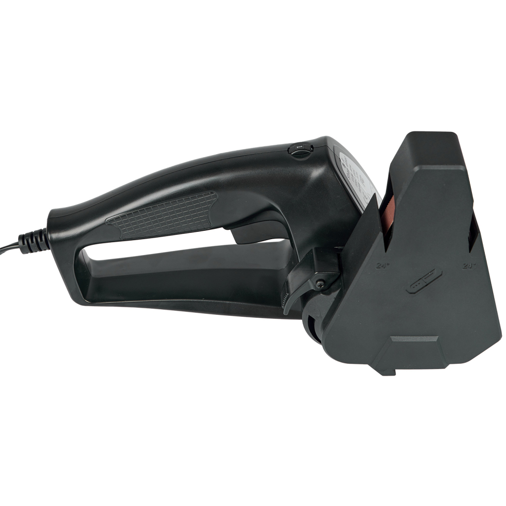 Заточный блок может устанавливаться в 4 позициях. Для облегчения и удобства процесса - имеется пластиковый кожух с заточными направляющими в 24 градуса. Электроточило имеет 6 уровней скорости, что добавляет вариативности при заточке конкретного инструмента. Полезным дополнением является наличие фиксатора кнопки включения, который позволит зафиксировать нужную скорость гриндера и убрать пальцы для более удобного хвата на рукоятке.