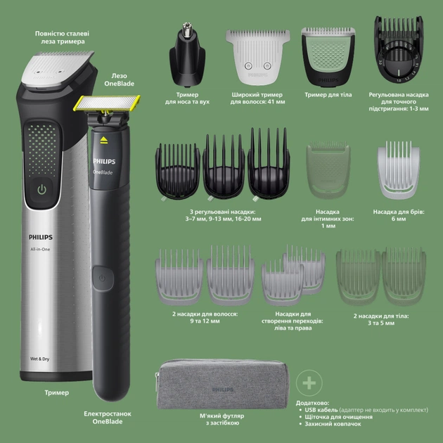 Philips MG9558/15 — це багатофункціональний All‑in‑One тример серії 9000 з 20 інструментами, які охоплюють догляд за обличчям, волоссям і тілом, включно з OneBlade, тримером для носа й вух, широкими насадками, а також деталями для точних контурів. Потужна технологія OneBlade із високо частотним рухом леза (6000 рухів/хв), гладким покриттям і закругленими кінчиками забезпечує чітку обробку контурів без подразнень. Леза з нержавіючої сталі, що самозагострюються, залишаються гострими як нові без необхідності в змазуванні.
