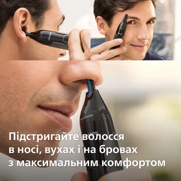 Просте й комфортне позбавлення від небажаних волосинок у носі та вухах. Перед використанням переконайтеся в чистоті ніздрів; вставте тример у ніс не більш ніж на 0.5 см і почніть виконувати акуратні кругові рухи. Перед використанням у вухах переконайтеся, що у вухах немає сірки. Під час підрівнювання брів установіть у пази одну з двох насадок (3 або 5 мм) і з невеликим тиском проведіть тримером проти напрямку росту волосся, щоб підрівняти волоски брів до потрібної довжини.