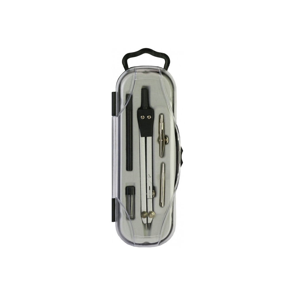 До набору входять: металевий циркуль 135 мм; голка-вимірювач; райсфедер металевий; тримач для райсфедера; запасний грифель; в пластиковому пеналі з підвісом.