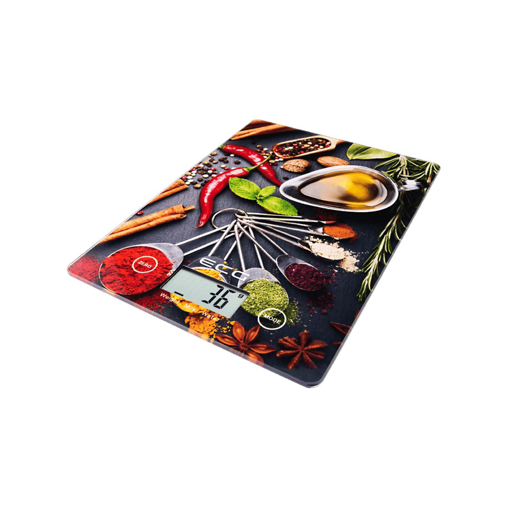 Ваги кухонні ECG KV 117 Chilli з максимальним навантаженням на 5 кг і кроком вимірювання 1 грам, обладнані плоскою скляною платформою.
