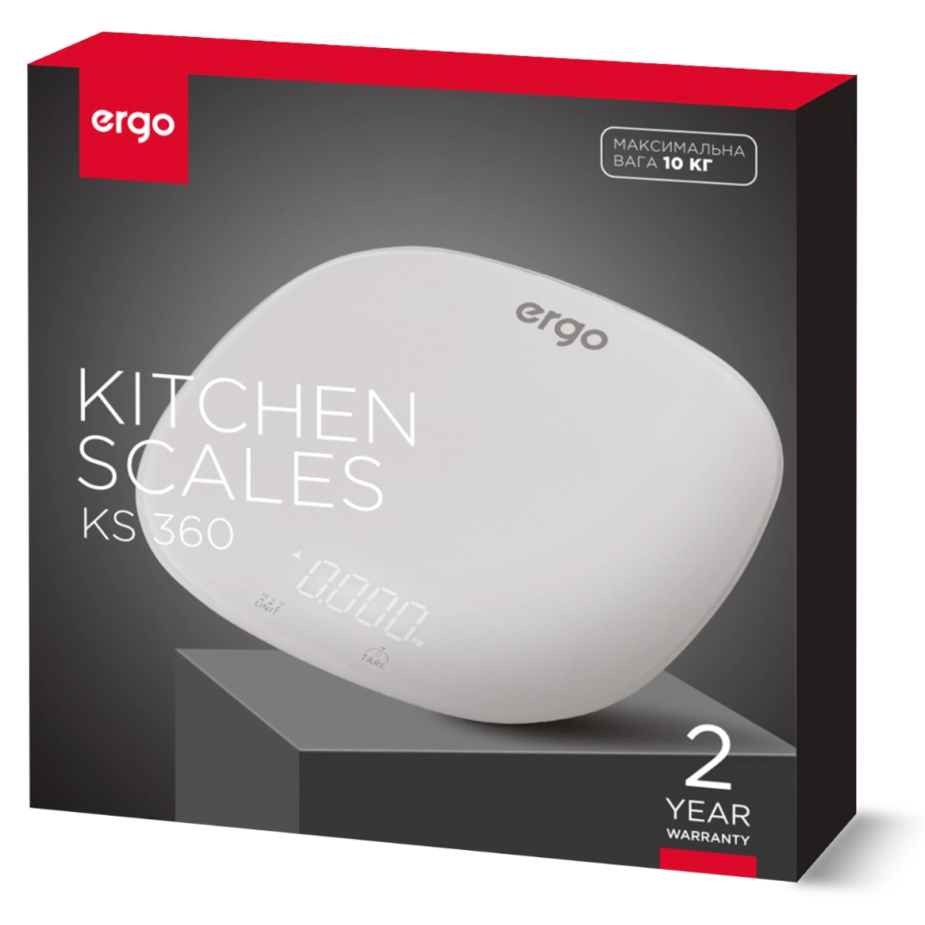 Ваги ERGO КS 360 у красивому білому кольорі – це стильний і практичний кухонний аксесуар, який допомагає вимірювати сипучі, рідкі та тверді продукти й готувати смачні страви завдяки точному дотриманню рецептури.