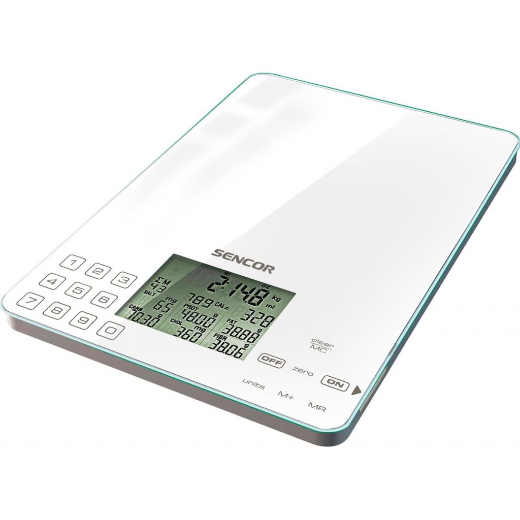 Ваги кухонні Sencor SKS6000 з максимальним навантаженням до 5 кг. Мають платформу із загартованого скла, сенсорне управління, РК-дисплей, ціну поділки до 1 г і функцію пам'яті до 99 продуктів. Ваги оснащені функцією послідовного зважування, функцією зважування з обнуленням тари, опцією для показу загальній живильній цінності для окремих компонентів. Одиниця виміру г / мл.
