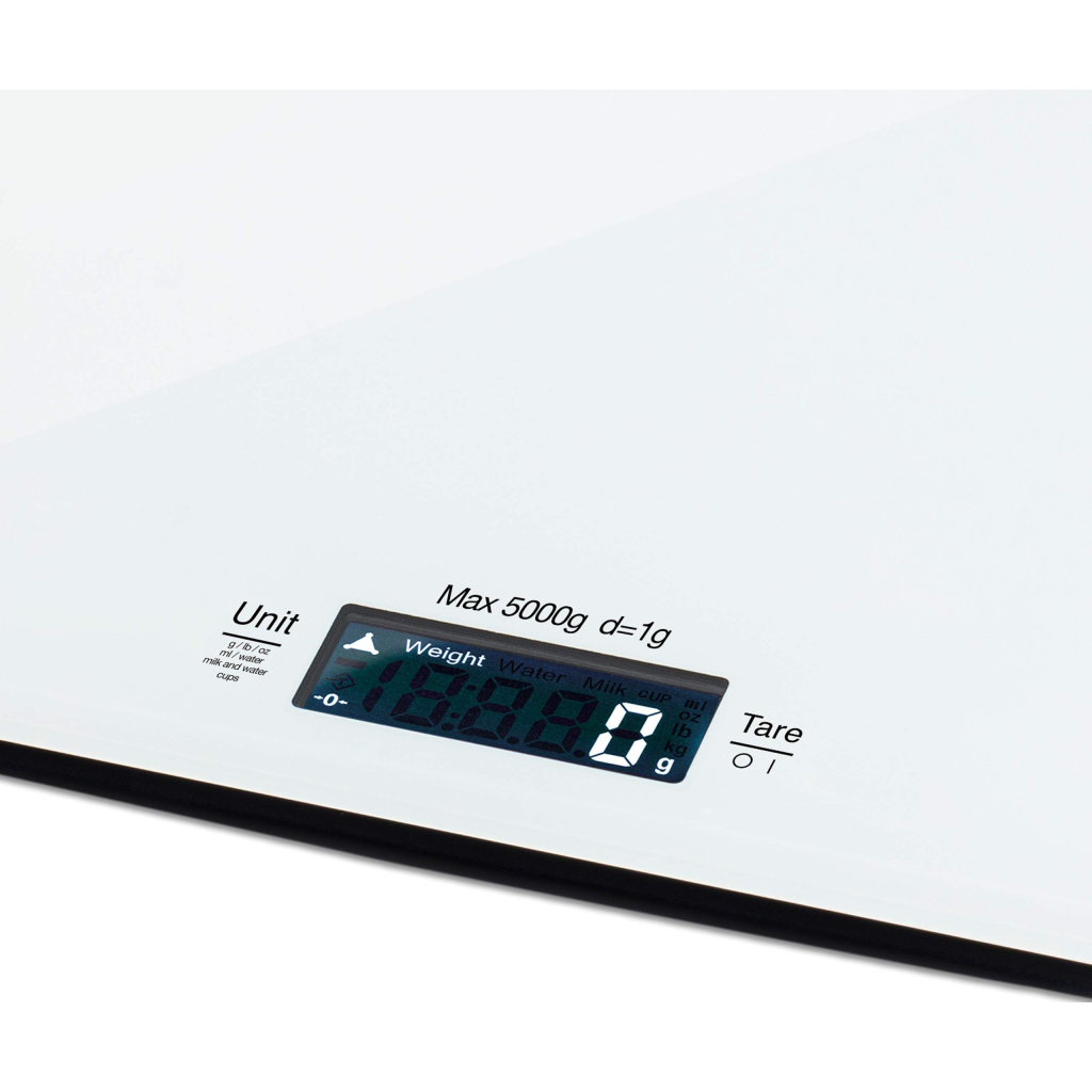 Плоска платформа виготовлена з міцного загартованого скла, тому користувач може не турбуватися при зважуванні важких продуктів, оскільки прилад має велику межу зважування - до 5 кг. Максимальний комфорт використання реалізується за рахунок автовідключення та корисної функції обнулення ваги тари.