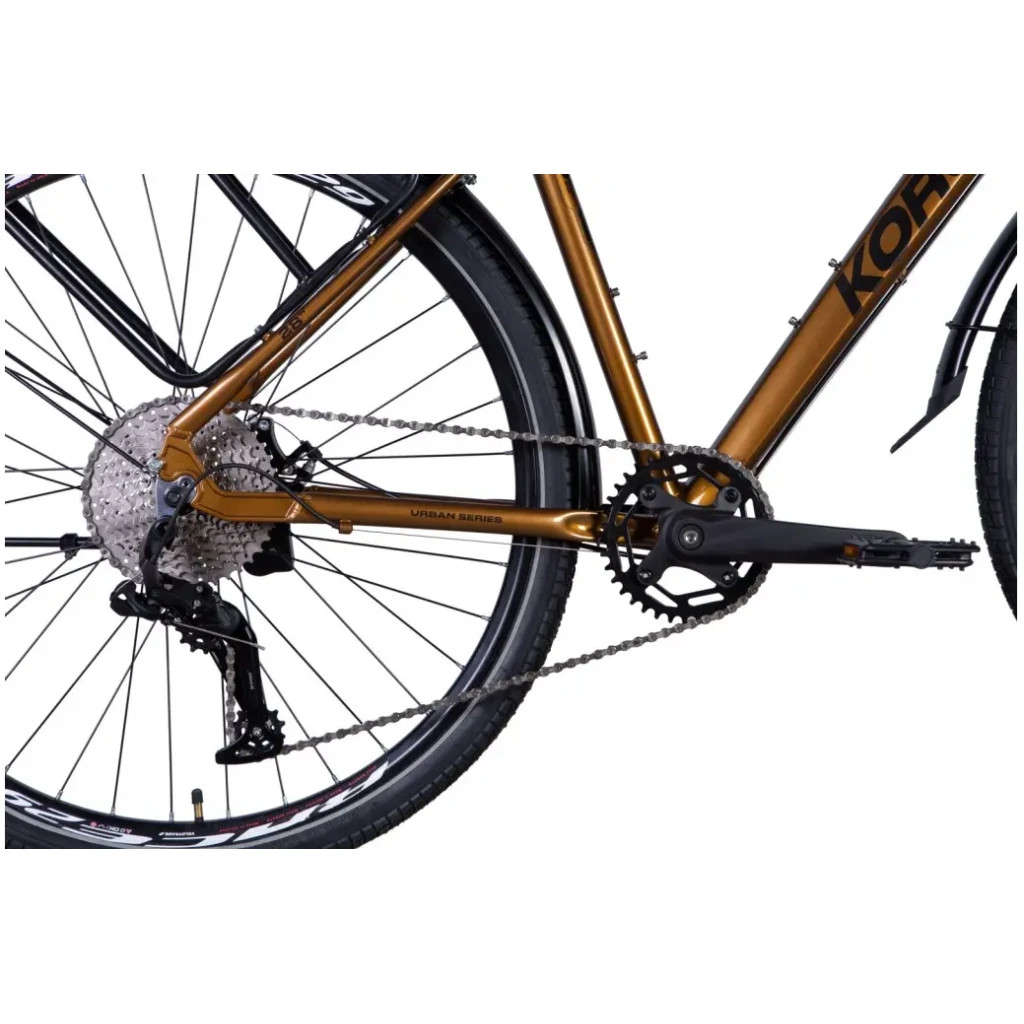 Діапазону швидкостей буде достатньо для подолання пагорбів середньої крутості та швидкого набору швидкості. Перехід ланцюга плавний та чіткий. Задній перемикач з прямим підведенням тросу L-TWOO RD-V5010-LX керується зручною монетою (важелями) SL-V5010-10 R10 з дисплеєм, що відображає поточну швидкість. Каретка закритого картриджного типу, вал обертається на промислових підшипниках. Педалі з широкою ковзною платформою.