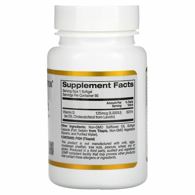 Вітамін D3 California Gold Nutrition містить 125 мкг (5000 МО) вітаміну D3 у вигляді холекальциферолу з ланоліну в капсулах риб'ячого желатину.