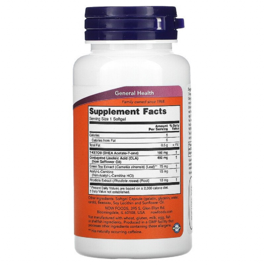 7-Keto – активний метаболіт гормону, який синтезується корою надниркових залоз – дегідроепіандростерону (DHEA). Саме цей гормон відповідає за термогенез – процес отримання клітинної енергії у вигляді тепла. Крім того, це один з головних гормонів в організмі, оскільки він є основним елементом продукції інших гормонів. Кількість DHEA - один із найдостовірніших показників для визначення біологічного віку людини. Саме тому, коли з віком знижується вироблення дегідроепіандростерону, що негативно впливає на всі процеси в організмі. NOW® 7-KETO® LeanGels™ як доповнення включає CLA (Кон'югована лінолева кислота), екстракт зеленого чаю, ацетил-L-карнітин та екстракт родіоли