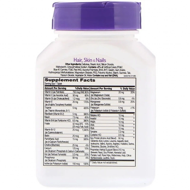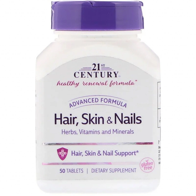Посилена формула для Волосся, Шкіри і Нігтів, 21st Century спрямована на боротьбу не тільки з косметичної стороною проблеми ослабленого волосся, нігтів і шкіри, а й перш за все з її внутрішніми факторами. Ця добавка, до складу якої входить Біотин, вітаміни А, С, Е і групи В забезпечить поживними речовинами організм зсередини, завдяки чому волосся перестане випадати, стане більш густим і блискучим, придбають здоровий вигляд; нігті стануть міцнішими, а шкіра пружною.