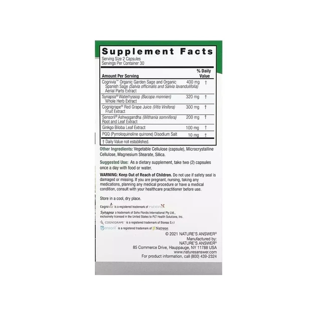 - Екстракт надземних частин органічної садової шавлії Cognivia™ та органічної іспанської шавлії (Salvia officinalis та Salvia lavandulafolia) 400 мг, Екстракт цільної рослини бакопи (Bacopa Monnieri) Synapsa® 320 мг, Сік Cognigrape® із екстракту плодів червоного винограду (Vitis vinifera) 300 мг, Sensoril®, екстракт коренів та листя ашваганди (Withania somnifera) 200 мг, Екстракт листя гінкго білоба 100 мг, Динатрієва сіль піролохінолінахінона (PQQ) 10 мг