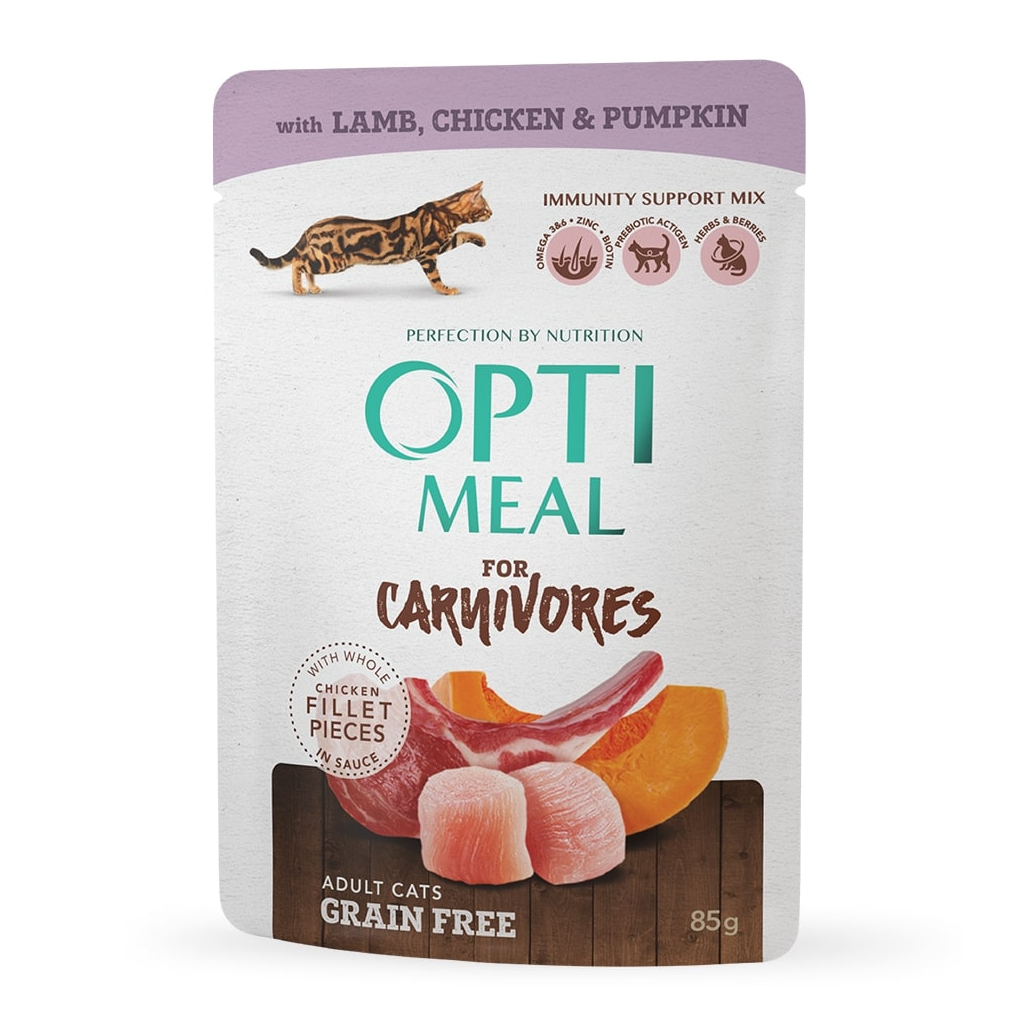 Вологий корм для кішок Optimeal беззерновий з ягням і курячим філе в гарбузовому желе 85 г (4820083905995)